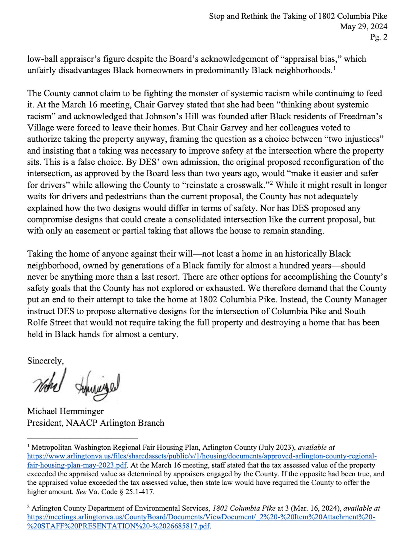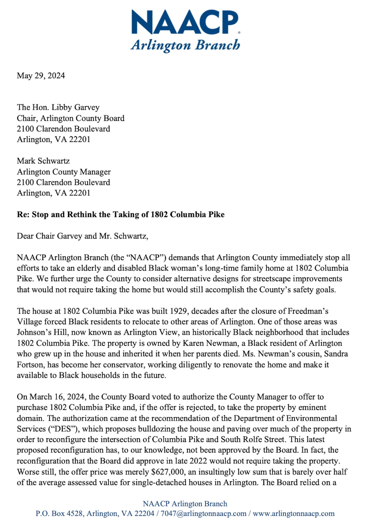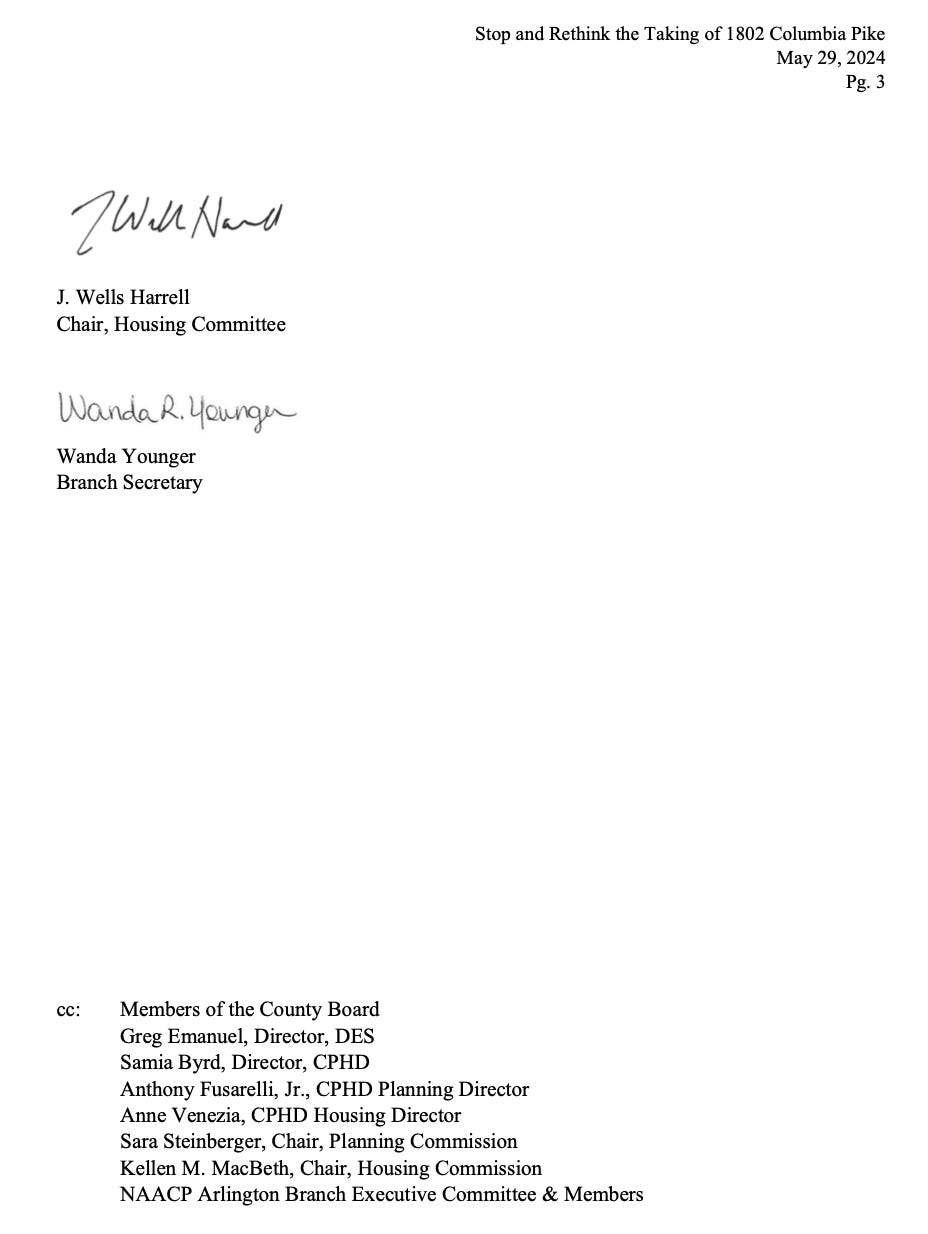 In a May 29, 2024 letter, Arlington NAACP President Michael Hemminger wrote that, “NAACP Arlington Branch demands that Arlington County immediately stop all efforts to take an elderly and disabled Black woman’s long-time family home at 1802 Columbia Pike. We further urge the County to consider alternative designs for streetscape improvements that would not require taking the home but would still accomplish the County’s safety goals.”